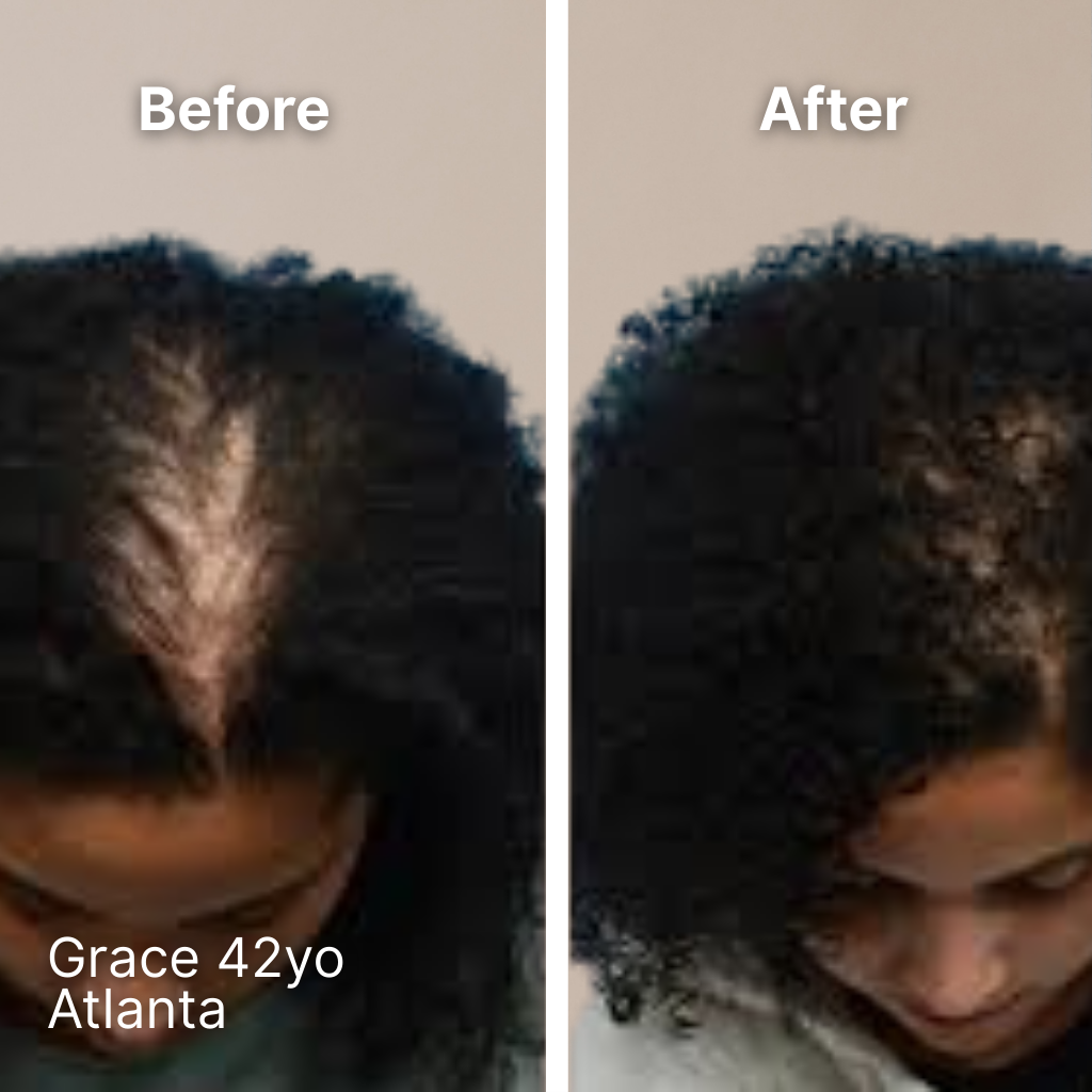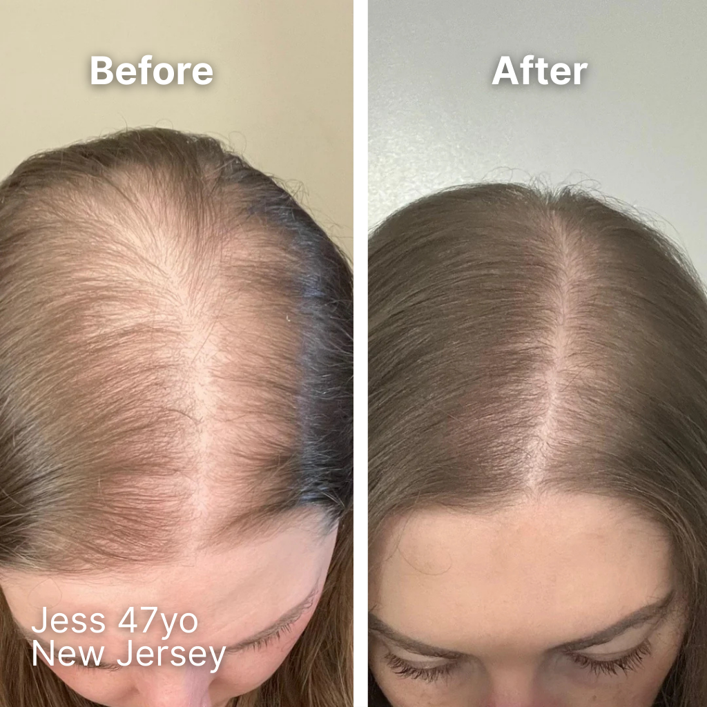 Reduced shedding usually shows up within 4-6 weeks. New growth becomes visible around 8-12 weeks. Meaningful improvement in thickness and coverage typically appears around 3-6 months. Hair regrowth is a biological process. It takes time, but it's worth it.